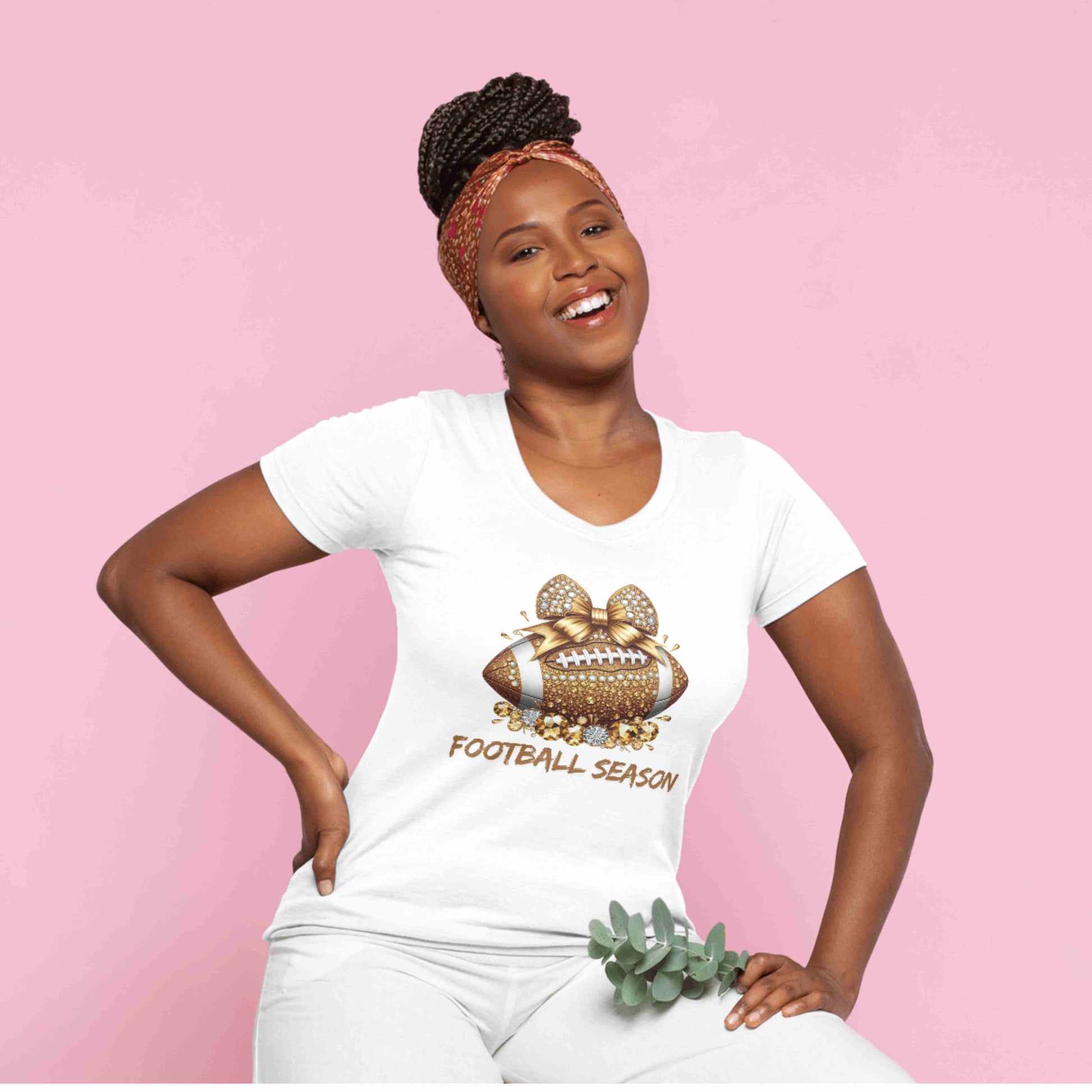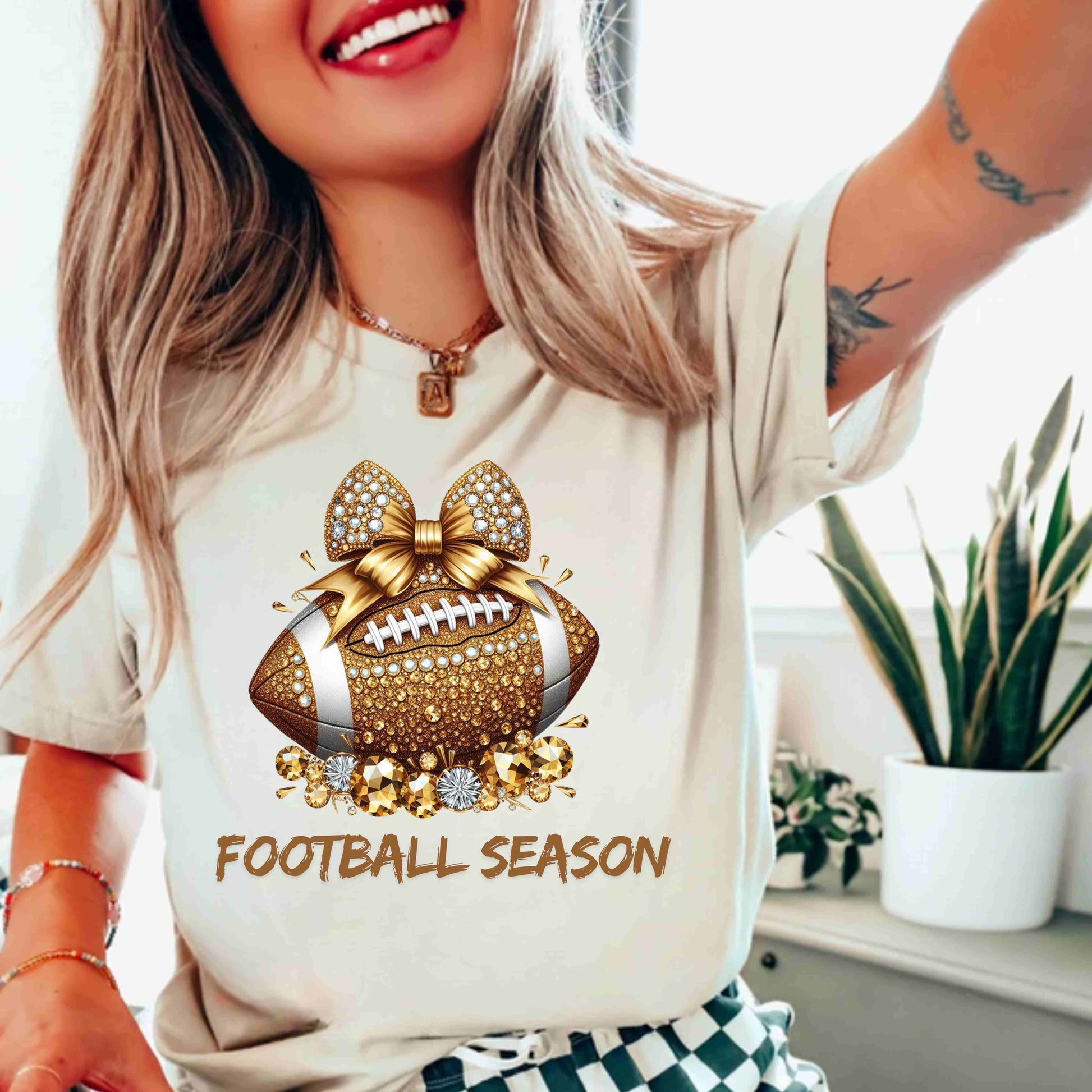 Elevate your game day attire with our Football Season Gold Bling T-Shirt. Featuring premium metallic gold designs on quality fabric, this shirt combines team spirit with sophisticated style. Designed for durability through multiple seasons while maintaining its eye-catching luster. The perfect statement piece for dedicated fans who appreciate both comfort and flair.